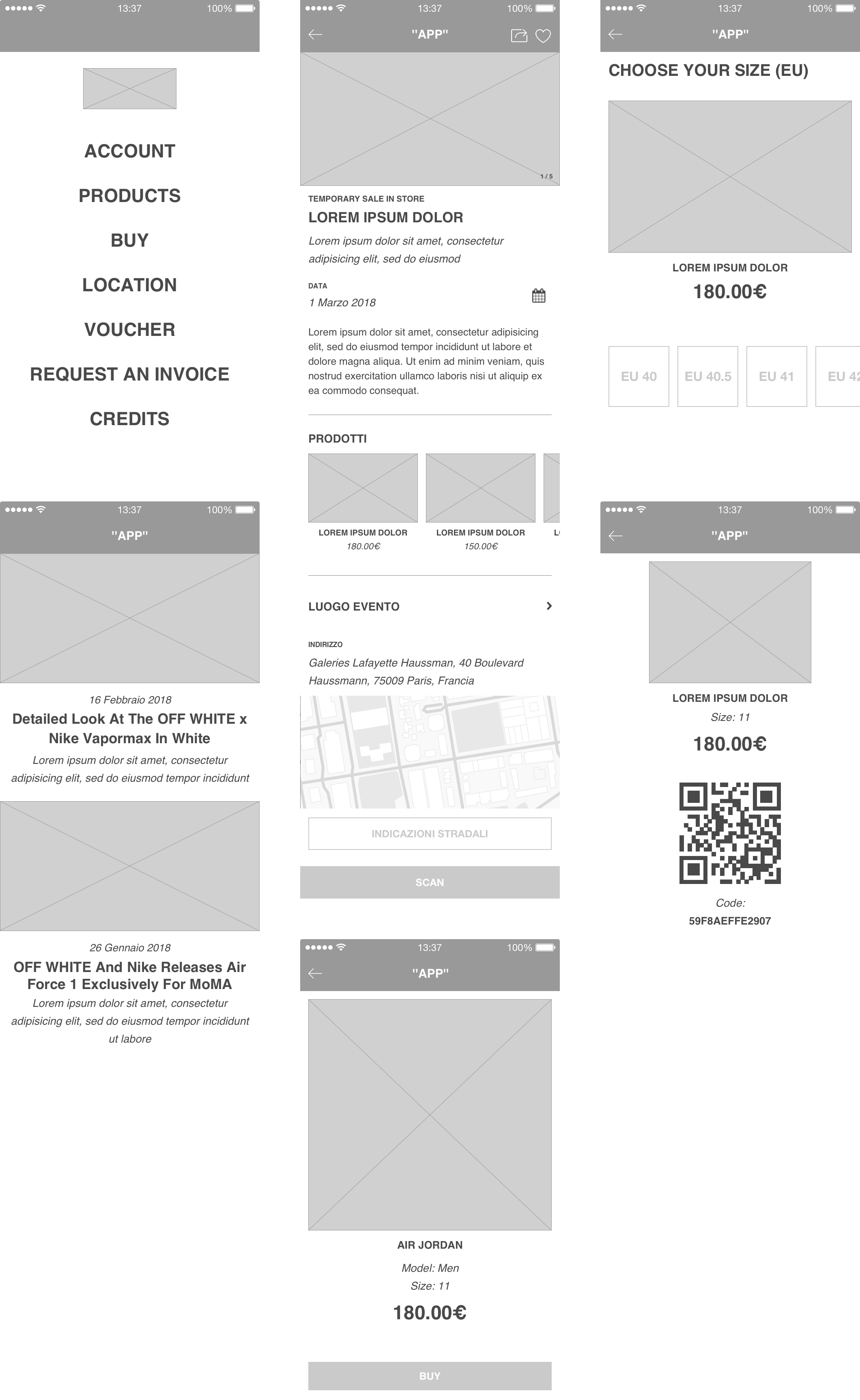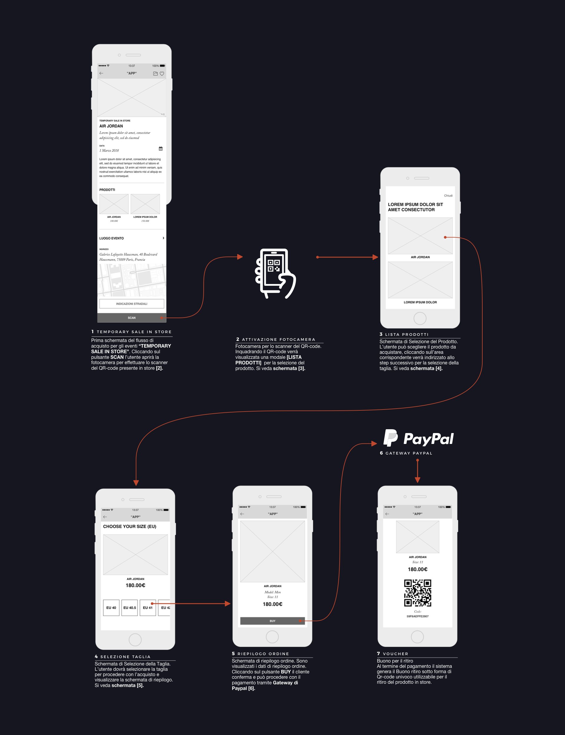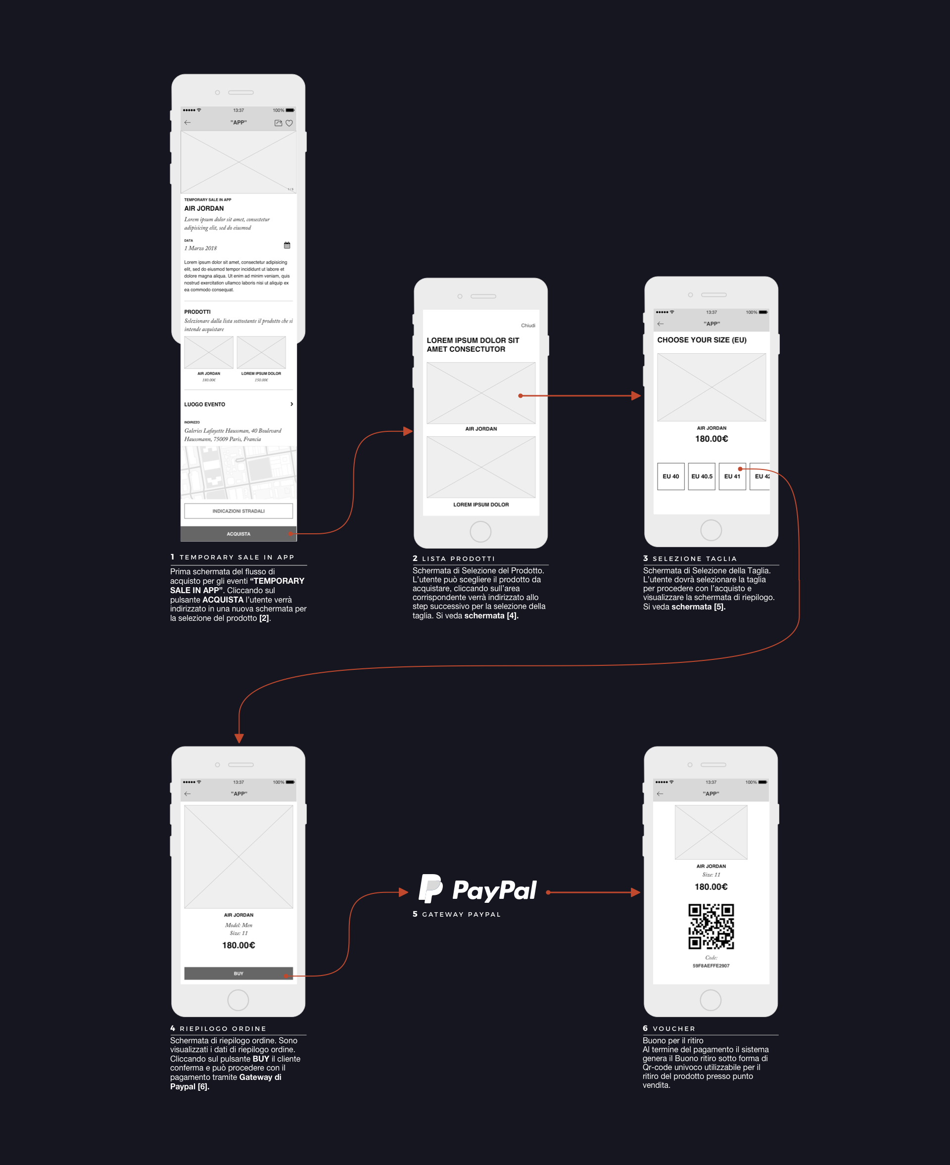 The process began with the scanning of the qr-code present on the installation of the event. These, directed to the list of products to buy, once the size was chosen, we proceeded with the payment through Paypal Getaway. Finally, after the user made the purchase, a unique QR code was created to collect the order which was immediately checked by the sales assistants through a QR code scanner that provided the validity of the voucher in real time and checked the data user.